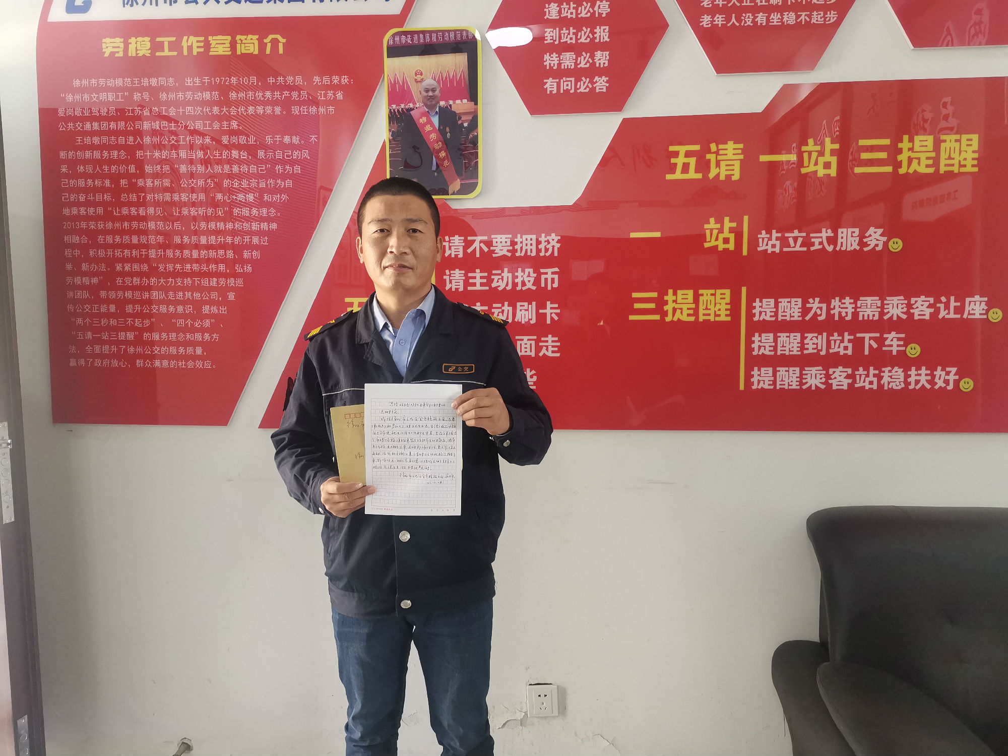 10月28日下午,一位滿頭銀發(fā)的老人拿著一封親手寫的感謝信來到了徐州公交新城公司,老人說:“有一位駕駛員,經(jīng)常幫助我和老伴,但我不知道他叫什么,只知道他在46路2750號(hào)公交車?!苯?jīng)核實(shí),正是46路公交駕駛員郭開明師傅。