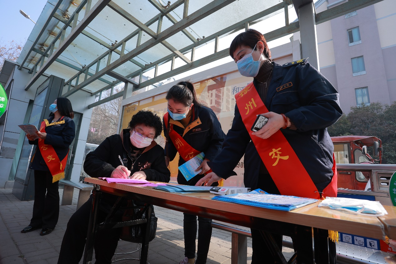活動(dòng)現(xiàn)場(chǎng),懸掛起了標(biāo)有“公交送溫暖、服務(wù)走在前”的橫幅標(biāo)語(yǔ),志愿者們統(tǒng)一身著行業(yè)服,身披鮮紅綬帶。大家分工明確,以飽滿的精神面貌向市民宣傳綠色出行,發(fā)放《徐州公交乘車線路指南》,引導(dǎo)市民文明乘車,解答市民問(wèn)題,協(xié)助駕乘人員做好“健康碼”查驗(yàn)工作,幫助老年人注冊(cè)“健康碼”,教老年人使用“徐州公交”APP查詢公交線路實(shí)時(shí)狀態(tài),攙扶特需乘客上下車等。
