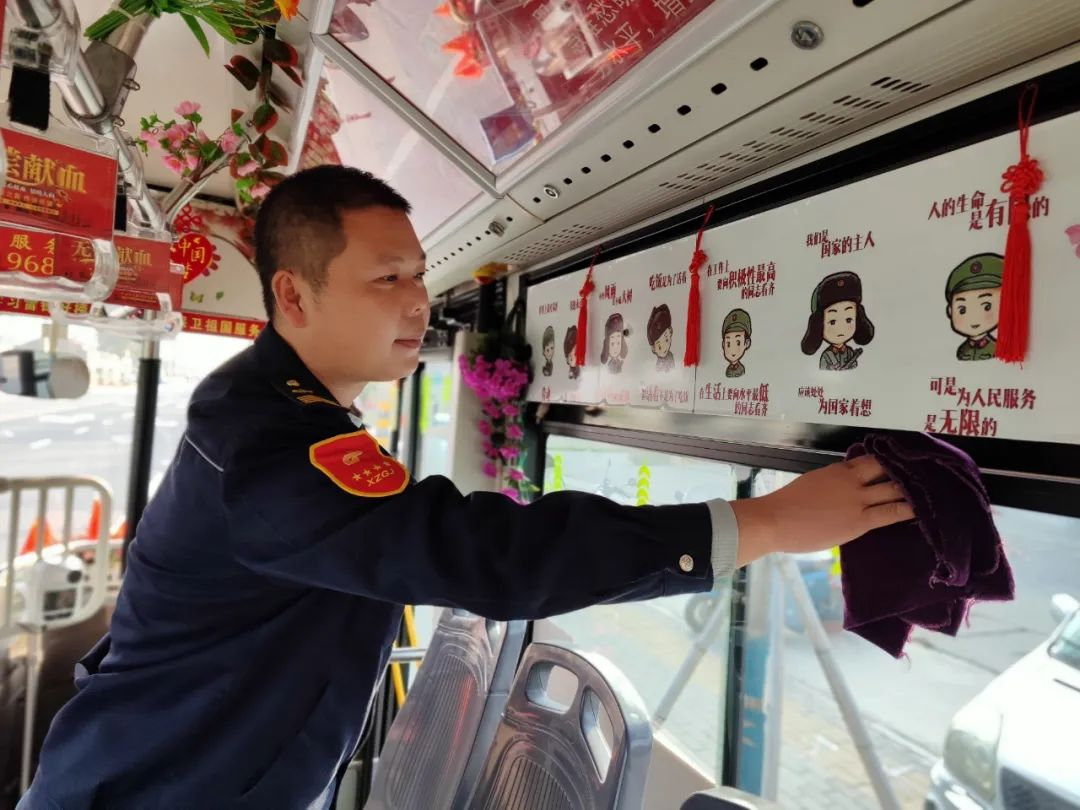駕駛座上的王石龍雙手把住方向盤(pán),安全平穩(wěn)駕駛著,每到一站,他都會(huì)仔細(xì)觀察乘客的上下車情況,并攙扶特需乘客坐到座位上,他用熱情的服務(wù)為乘客送去溫暖。走進(jìn)王石龍的車廂,紅色的主題格外引人矚目,扶手被用紅絲絨布套包裹得嚴(yán)嚴(yán)實(shí)實(shí),一個(gè)個(gè)的座位上整齊地放置著棉坐墊,車廂內(nèi)溫馨的感覺(jué)縈繞著乘客,感到冬日里格外的溫暖。他還自費(fèi)更新了紅色小人書(shū),放置了醫(yī)藥箱、便民袋、針線包、速效救心丸、一次性雨衣等等,細(xì)微之處彰顯了王石龍對(duì)工作的用心和對(duì)崗位的熱愛(ài)。