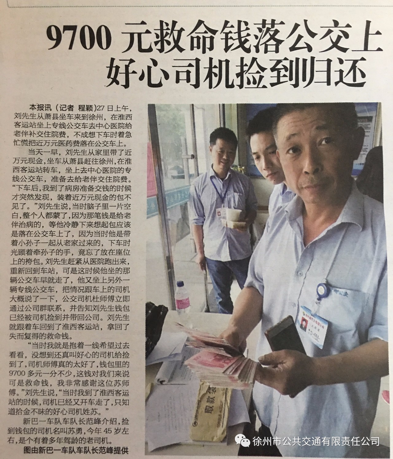 車隊管理人員打開包尋找乘客的聯(lián)系方式,發(fā)現(xiàn)包里有一個信封,信封里面裝著9700元現(xiàn)金,便立即將包妥善保管。不久,失主劉先生來到調(diào)度室尋找,看到失而復得的包裹十分激動,他說:“我抱著一線希望來這兒看看,沒想到還真叫好心的司機給撿到了,9700元一分不少。這錢對我們來說是救命錢,今早到醫(yī)院給老伴補交住院費的,我非常感謝蘇師傅”。