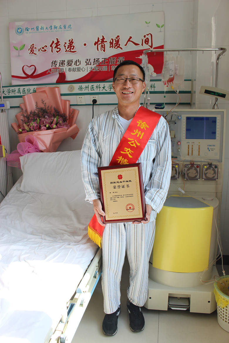 2018年10月30日上午8時許,徐州醫(yī)科大學附屬醫(yī)院血液科,37歲的公交小伙兒鄭剛異常平靜地躺在病床上,殷紅的鮮血汩汩從兩只手臂上連接著不停運轉地造血干細胞采集機器的針管間流淌,經(jīng)約3小時的采集,這份帶著濃濃深情和殷切希望、143毫升的造血干細胞混懸液,將為一名3歲白血病男孩送去生命的火種。鄭剛也成為徐州公交系統(tǒng)首例、徐州市第77例造血干細胞的捐獻者。