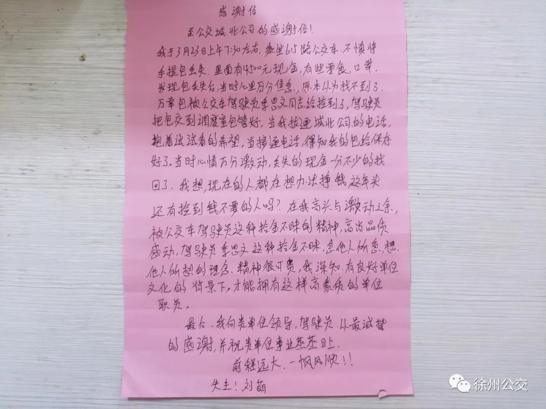 前幾日,市民劉女士在二十四中乘坐615路6952車前往城建家園,上車后,劉女士將隨身攜帶的手提包放在了座位上,下車時(shí)有些匆忙,將手提包遺忘在了車上。駕駛員季恩文到食品城公交首末站打掃衛(wèi)生時(shí),發(fā)現(xiàn)了劉女士丟失的手提包。由于已經(jīng)到了發(fā)車時(shí)間,季師傅將包收好,到達(dá)劉灣調(diào)度室后交給了工作人員。經(jīng)檢查,包里有4500元現(xiàn)金、駕駛證、身份證等重要物品,此時(shí),發(fā)現(xiàn)手提包丟失了的劉女士也撥打了服務(wù)熱線,得知她的物品已被妥善保管后,劉女士十分激動(dòng)。當(dāng)天下午,劉女士拿回失物并特意寫了一封感謝信表達(dá)對(duì)季師傅的感激之情。