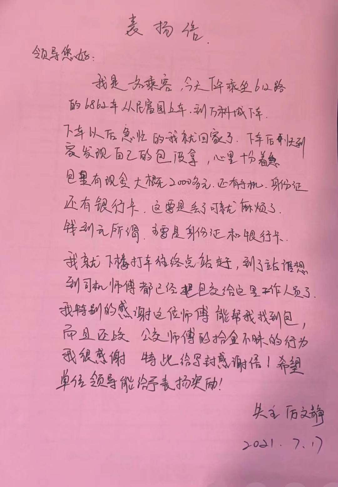 “到家后,我發(fā)現(xiàn)包不見,于是抱著試試看的心態(tài),來到九里停車場(chǎng)調(diào)度室詢問,沒想到好心的公交司機(jī)幫我找到了。”厲大姐緊握王師傅的手連聲致謝,當(dāng)場(chǎng)寫下了一封表揚(yáng)信。