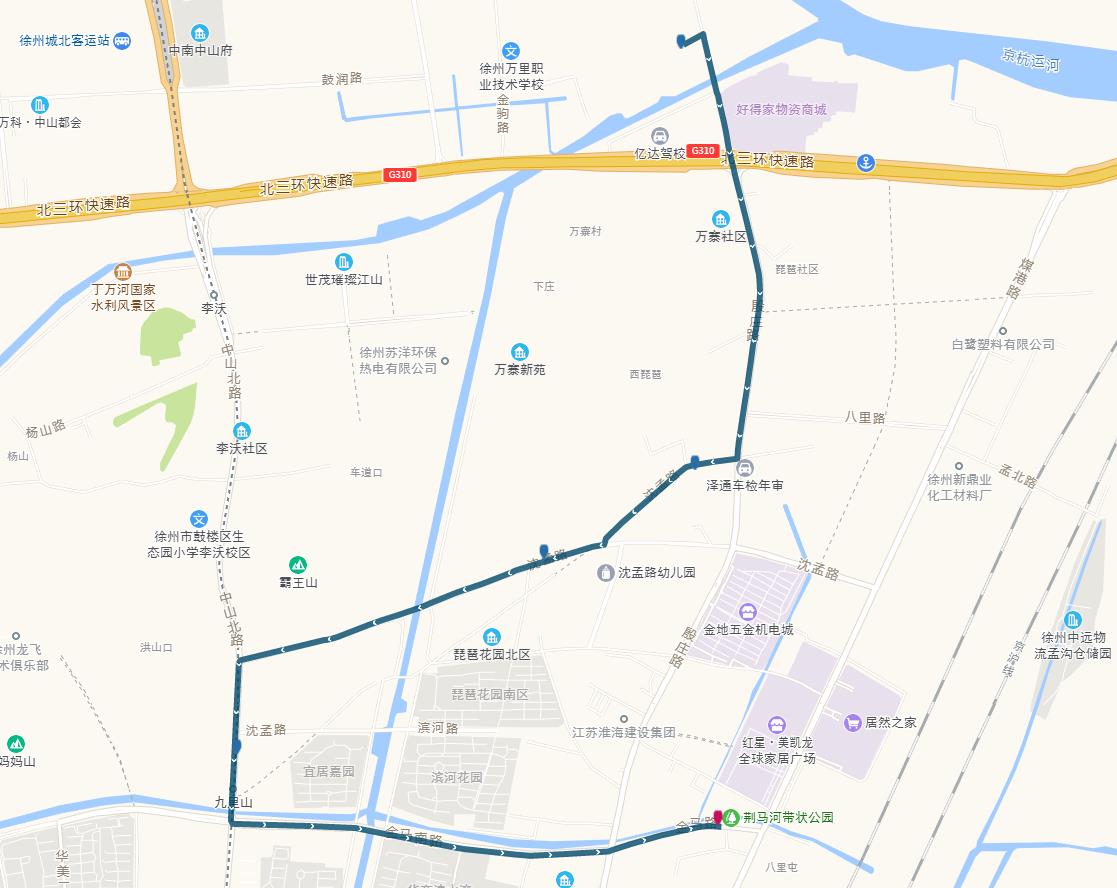 線路站點(diǎn):淮東家具城、濱河花園、九里山地鐵站、彭場、金駒物流園。