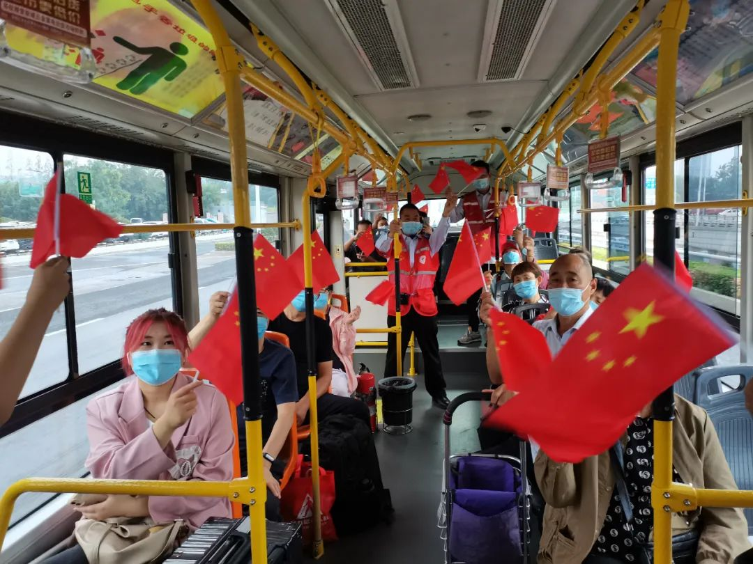 志愿者們走進公交車廂,現(xiàn)場與乘客們互動,通過提問節(jié)日和防疫小知識,獎勵口罩、紅旗、鑰匙環(huán)等小禮物,并與市民乘客們共唱《我和我的祖國》,熱鬧歡慶的氣氛感染了整個車廂,彰顯了“奉獻、友愛、互助、進步”的志愿精神。
