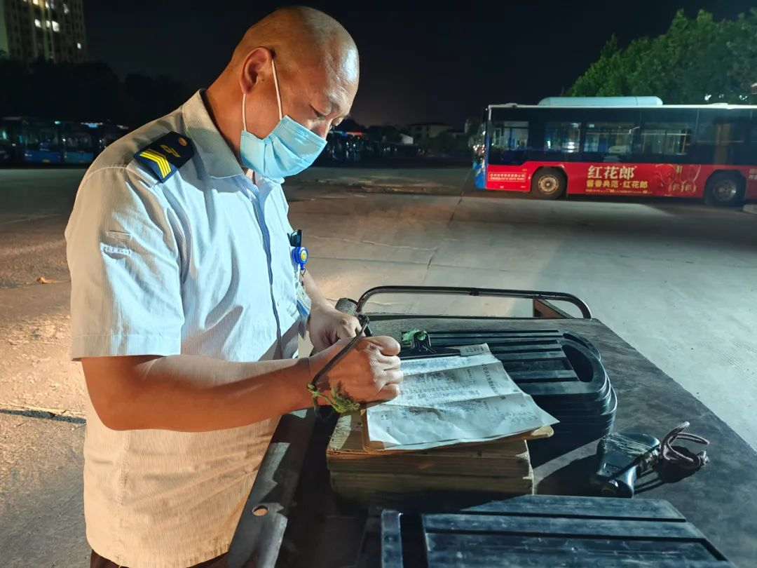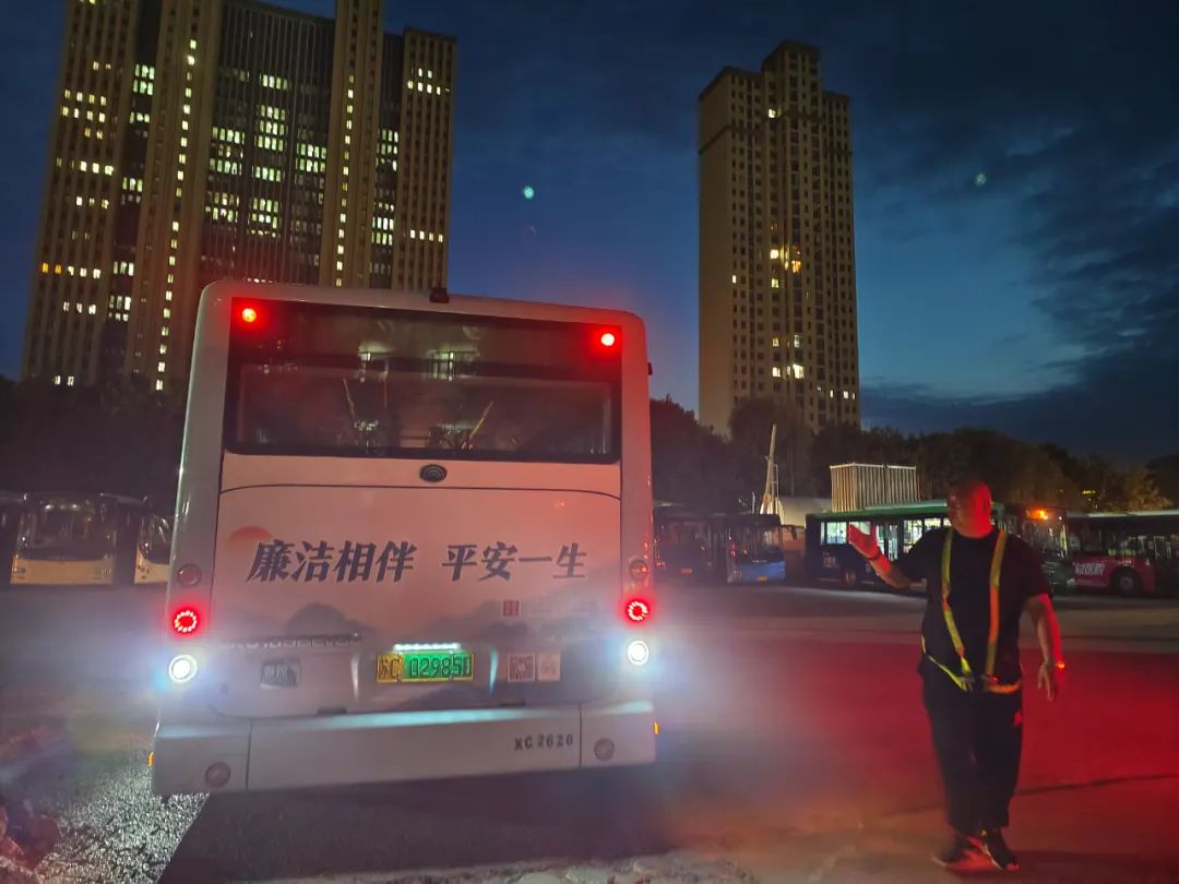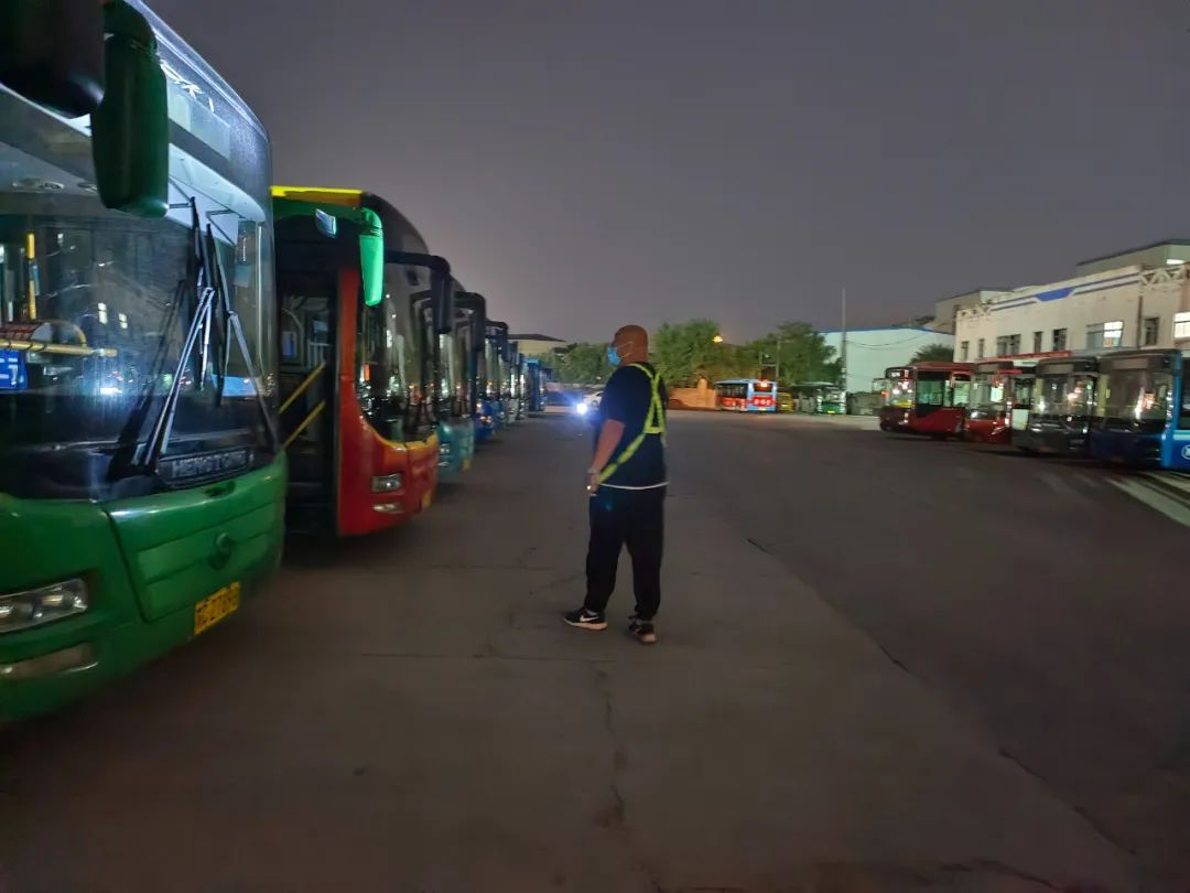進(jìn)入丑時,許多人都已進(jìn)入夢鄉(xiāng),末班車回場,在萬籟俱靜的夜里,內(nèi)保員徐智指揮倒車,同時還要逐個檢查停車場內(nèi)的車輛擺放,匯報車輛歸場情況,確保車輛全部安全歸場。