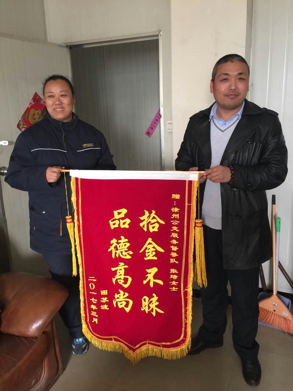 3月29日,正在站臺(tái)執(zhí)勤的督導(dǎo)員張琦撿到乘客掉落的公文包,經(jīng)查看發(fā)現(xiàn)包內(nèi)有蘋(píng)果筆記本一臺(tái)和一個(gè)錢(qián)包,但并沒(méi)有找到皮包主人的聯(lián)系方式。張琦把包放在了調(diào)度室等待失主來(lái)認(rèn)領(lǐng),約一小時(shí)后失主匆忙趕來(lái)尋找。失主見(jiàn)到失而復(fù)得的皮包非常激動(dòng),經(jīng)過(guò)詢(xún)問(wèn)得知失主姓田在徐州礦業(yè)大學(xué)工作。田先生說(shuō),“電腦里存有非常重要的資料和聯(lián)系方式,丟包之后萬(wàn)分焦急,真心感謝公交督導(dǎo)員?!彪S即從錢(qián)包里拿出400元錢(qián)塞給張琦作為答謝,張琦表示:“路不拾遺本就是自己的義務(wù),作為站臺(tái)督導(dǎo)員經(jīng)常會(huì)在站臺(tái)撿到乘客掉落的物品,不管東西貴重與否我們都會(huì)幫失主妥善保管等待認(rèn)領(lǐng)。”3月31日,田先生和他的愛(ài)人送來(lái)錦旗表示感謝!